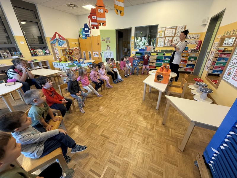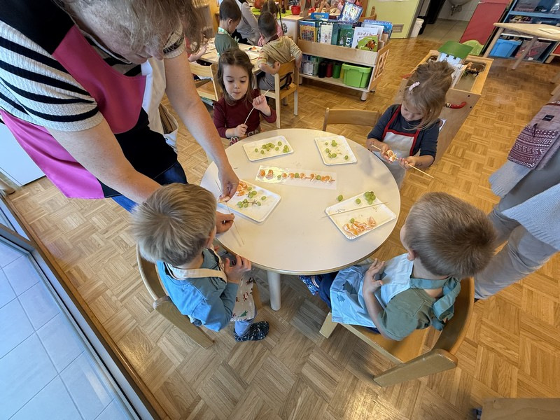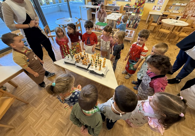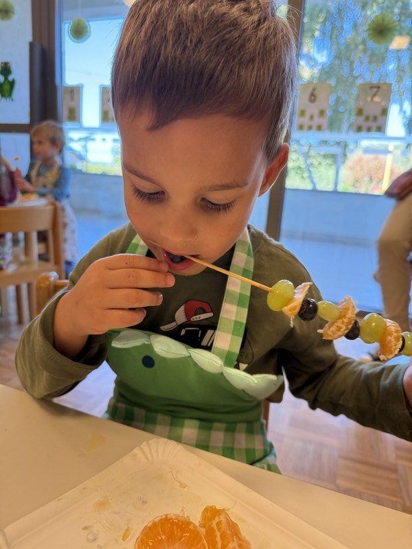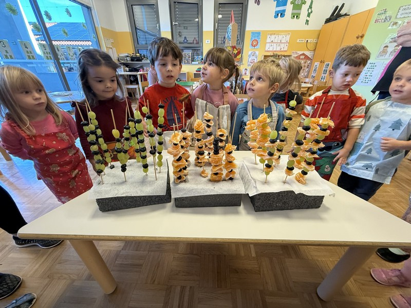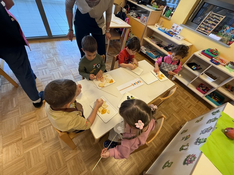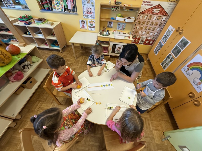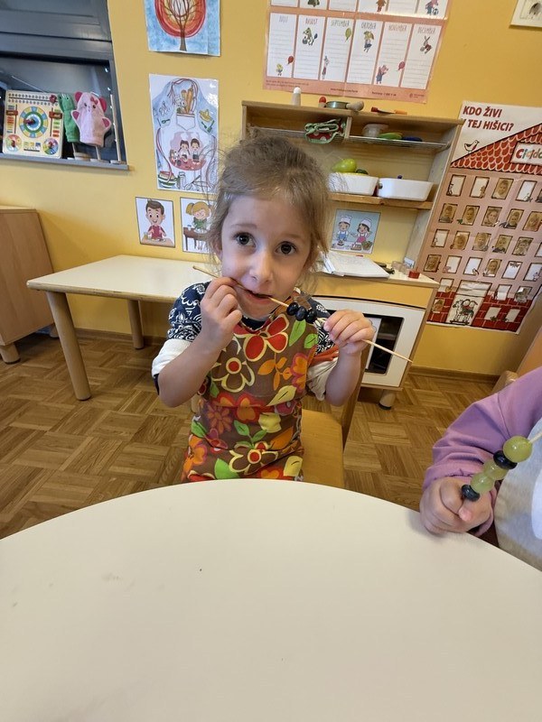 V uvodni dejavnosti so s tipanjem poskušali prepoznati sadje v skrivnostni škatli, nato pa ga urejali po zaporedju. Sledili so koraki priprave, in sicer najprej so si nadeli predpasnike, umili roke, umili sadje in ga razvrstili ter pripravili lesene palčke in papirnate krožnike.