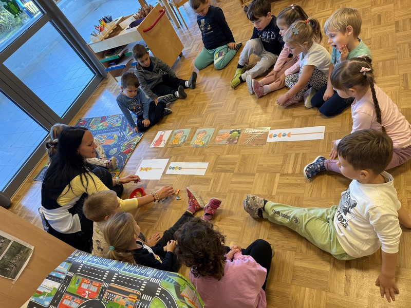 Otroci so delali v treh skupinah, vsaka skupina pa je imela slikovni prikaz svojega zaporedja. Vzorec so pripravili s konkretnim sadjem in ga nadaljevali, nato pa so si sami ustvarili nove zaporedne kombinacije.