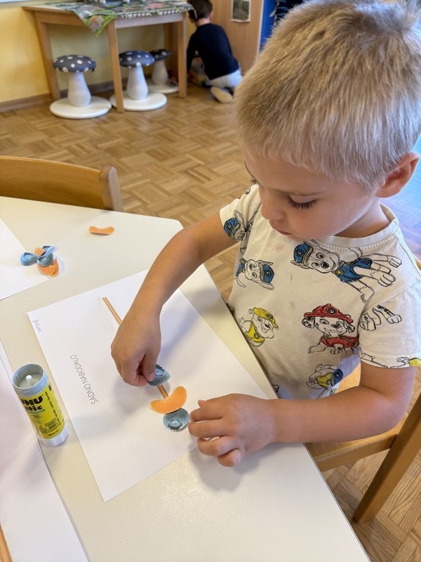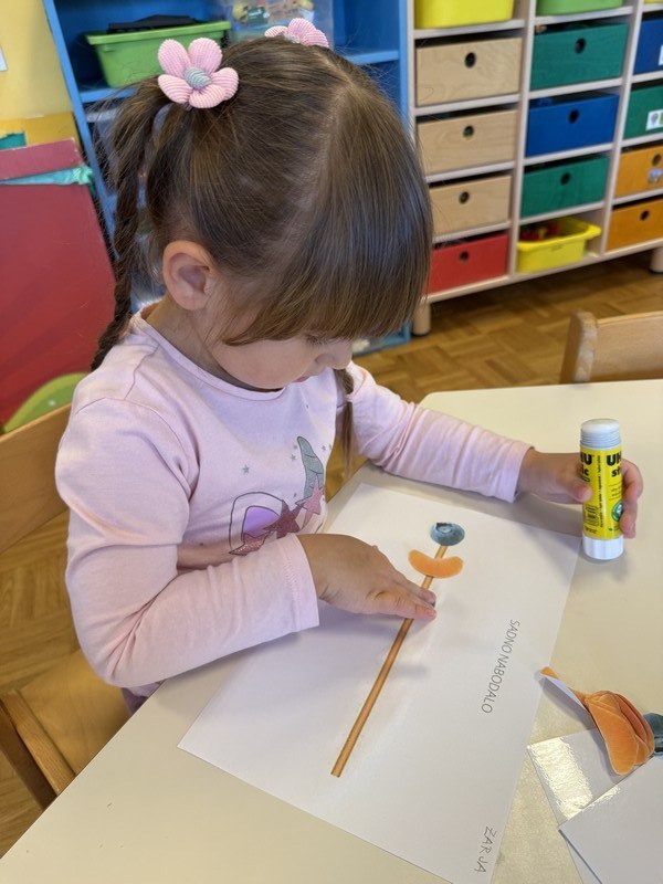 V naslednjih dneh pa je vsak otrok ustvaril tudi svoj slikovni prikaz zaporedja, z lepljenjem slik sadja. Dejavnost je bila odlična priložnost za učenje skozi igro, sodelovanje, ustvarjalnost in razumevanje zaporedij.