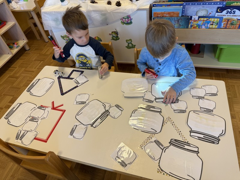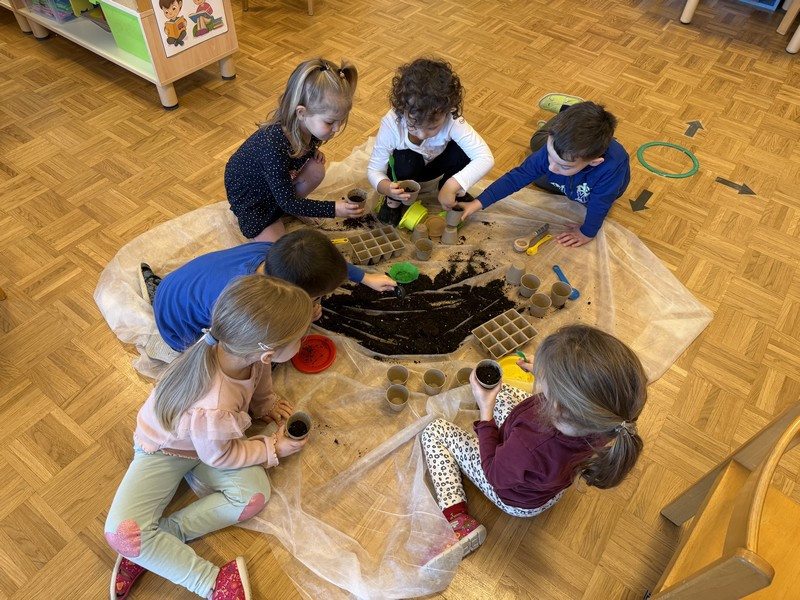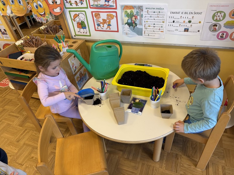V okviru projekta Raček so otroci skozi izkustveno učenje raziskovali, kako iz majhnega semena zraste zelena rastlina. Dejavnost se je začela z obiskom škrata, ki je prinesel semena božičnega žita. Otroci so jih opazovali, tipali in ob pogovoru razmišljali o tem, kaj rastlina potrebuje za rast. Lončke so nato ustvarjalno okrasili ter jih pripravili za sajenje. Po dogovorjenem zaporedju so posejali žito – dodali zemljo, posejali semena, zalili in lončke postavili na svetlo mesto. Pri tem so razvijali natančnost, samostojnost in razumevanje pomena pravilnega zaporedja korakov.