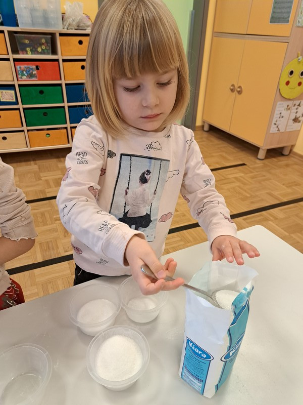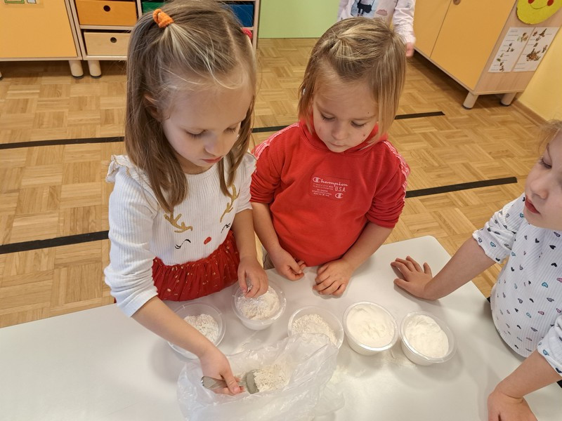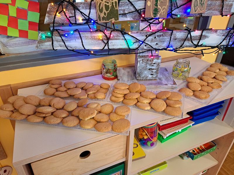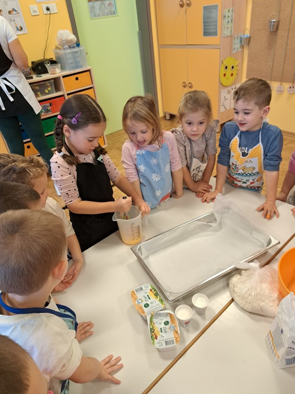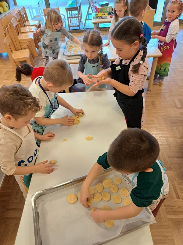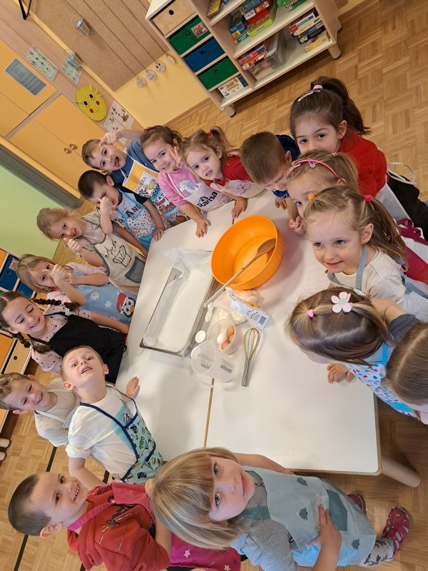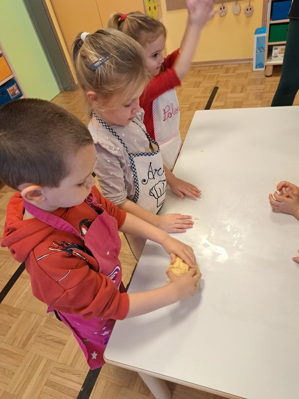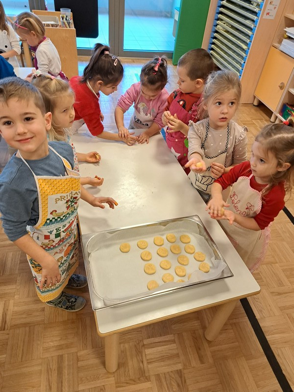 V jutranjem krogu so otroci prejeli posebno pismo škratkov, ki so jih prosili za pomoč pri peki piškotov. Pismo je pri otrocih vzbudilo veliko radovednosti in motiviranosti za reševanje izziva. Najprej so našteli sestavine, ki so potrebne za testo in potrebne pripomočke. Škratki so v pismo priložili svoj recept za piškote in otroke prosili, da sledijo zapisanim korakom izdelave. V vrtčevski kuhinji smo dobili vse potrebno, odnesli v igralnico, si nadeli predpasnike in začeli.