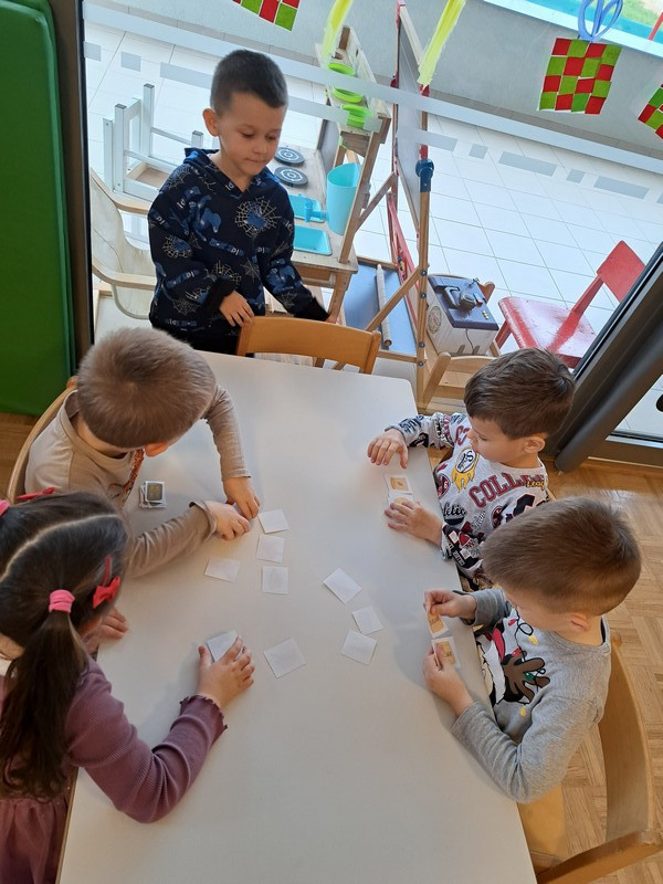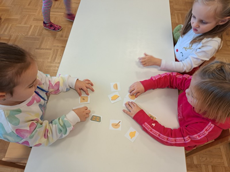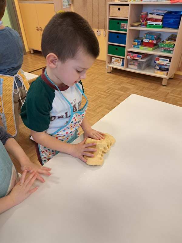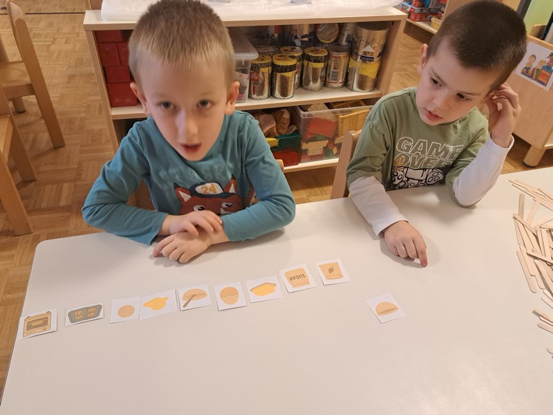 V nadaljevanju so otroci v manjših skupinah razporejali slikovno zaporedje korakov mešanja sestavin, gnetenja, oblikovanja, peke ter o postopku pripovedovali. Utrjevali so razumevanje vzorcev, zaporedja, razvijali elemente računalniškega mišljenja, obenem bogatili jezikovno izražanje in komunikacijske spretnosti, razvijali motoriko rok, dlani in prstov ter krepili sodelovanje in vztrajnost.