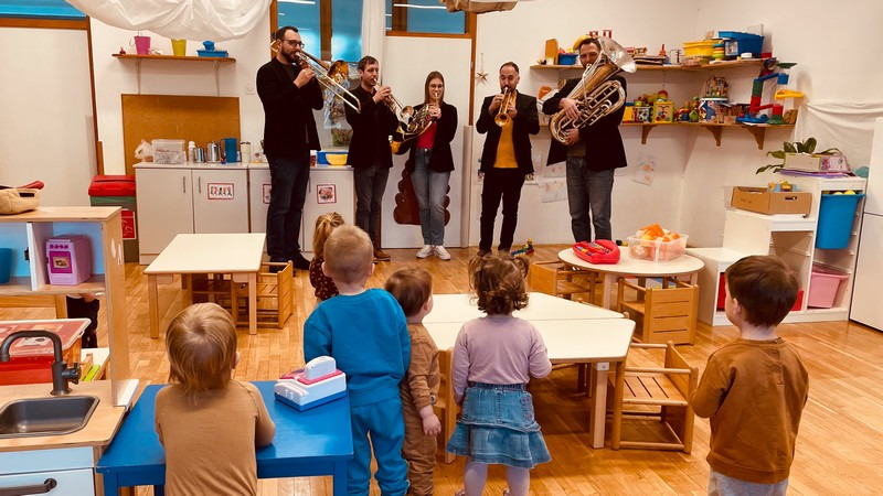 V vrtec so prišli na obisk učitelji Glasbene šole Koper, da bi nam na zabaven način predstavili trobila, ki jih poučujejo. Najprej so obiskali najmlajše v njihovih igralnicah, nato pa so v telovadnici pripravili predstavitev za ostale vrtčevske otroke in prvo triado osnovne šole. Predstavili so svoje inštrumente, pokazali, kako se nanje igra, ter nas razveselili z znanimi pesmimi, ob katerih smo z veseljem zapeli. Dopoldne je minilo v prijetnem vzdušju, zato jih z veseljem povabimo spet prihodnje leto!